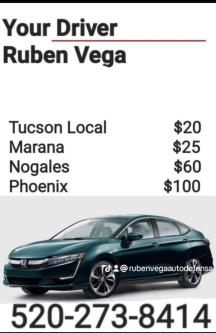 $20 Dlls all of Tucson One Way, $30 round trip. $25 Sahuarita, Vail, Green Valley and Marana to anywhere in Tucson. Airport Runs, Bars, Clubs, Errands, Appointments. Local, State and Nationwide Transportation. You set the price or help me set it to something fare for the both of us. I'll also give you credit if your not doing well on $$. My name is Ruben U.S. Marine Veteran. My number 520-273-8414. More effective if you text and even better if it's ahead of time cause I'm never where I'm needed at the time of request. We drive all over United States.