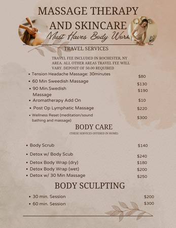 Looking to get some care,(read entire ad) why leave the comfort of your home? I'll bring the spa experience right to you. See photo for Services and prices. Rochester, NY service fee is included. Anything outside of Monroe (read entire ad)County has an additional travel fee, I travel as far as Buffalo, NY. A few things about me My name is Erin, I'm a licensed Massage Therapist, Esthetician. I'm certified in Body stretching, Meditation, Sound Healing, and more. My intention is to provide a relaxing service for you, that's all about you. I DO NOT MAKE/TAKE SAME DAY APPOINTMENTS. I require a 48 hour request for all appointments. SEE PHOTO FOR SERVICES AND PRICES!!! Deposit is required for your appointment
